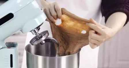 3、**一下面团,面团已经出膜(但是膜很脆弱很容易扯断,还没有达到扩展阶段)。制作可颂面团,揉到这个程度就可以了(可颂面团后续还要经过反复多次的折叠,折叠过程中面筋会继续生成,所以不需要揉到扩展阶段)。揉好的面团盖上保鲜膜,放入冰箱冷藏半个小时。