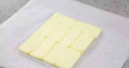 4、将145克裹入用黄油切成片,在油纸上并排摆成一个大片(小块黄油需要这样处理。如果你用的是片状黄油则可以省略这一步)。