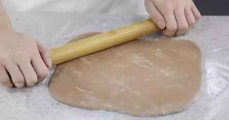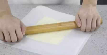 5、在黄油上盖一层油纸,用擀面杖擀一擀,使黄油片能粘连起来,并变得更薄一点。