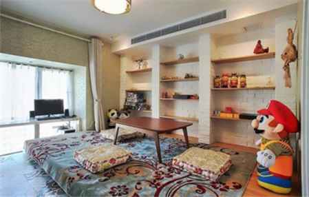 点评:如图所示,这是一款名副其实的东南亚风,采用榻榻米为设计主题,为了突出主题,采用多种的亮色系进行装饰,旁边放了一个马里奥,尤其是木质置物架的使用,简单且实用,没有采用多余的修饰,反而更能体现自然的味道。