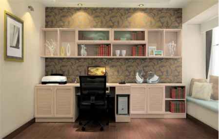 点评:这个书房的矮柜设计非常地实用,书桌与吊柜的拼搭非常地自然,丰富的柜体设计可以收纳很多书籍,主人不常用的物品也是可以得到完美的收储,吊柜也可以作为饰品柜来使用,暖色的墙纸烘托出来的雅致的氛围,白**面板正流行,吊顶造型阳光有魅力。
