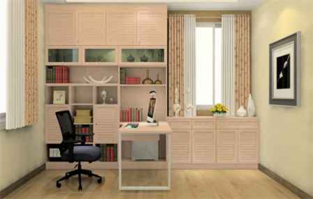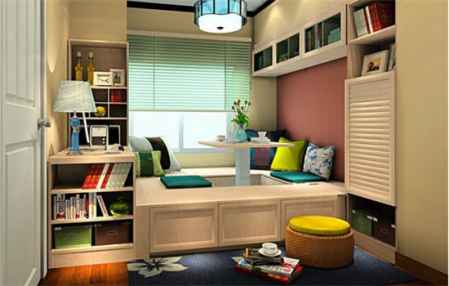 点评:白**的百叶板设计给人很时尚的感觉,榻榻米的造型大大地节省了空间,设计师利用飘窗设计了书柜和升降式的桌子,完美的柜体造型也让书房变得更加地实用而美好。暖色调的搭配也让整个空间变得更有灵动性了,不得不说这个空间的定制性和功能性是非常强的。