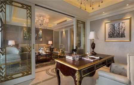 点评:图中书房的设计是古典风格,书房采用的是推拉门的设计,大气的推拉门采用了大量的金色雕饰勾勒出精美的花纹,彰显出主人的尊贵气质,客厅与书房紧密相连,中间用玻璃推拉门隔开,将客厅的杂声牢牢挡在外面,享受安静的阅读时间。