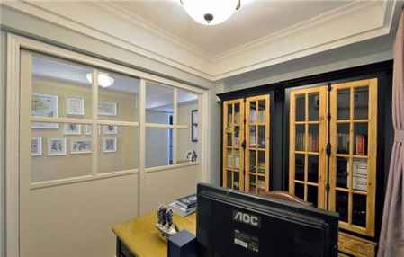点评:图中书房的空间还是比较小的,米色的推拉门加上格子的透明玻璃,下部则是实体木门,如果设置对开门就会占去书房的很大一部分,让小空间更加狭小,而推拉门则能解决这种烦恼,这种虚实结合的设计手法让推拉门和整个空间完美融合。