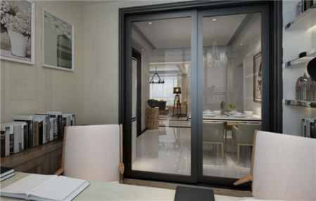 点评:图中的书房设计是非常的简约大方的,采用的是极为简单的黑色框加上玻璃的推拉门,透过书房门就能看见设计简约清新的餐厅空间,书房内用简约艺术画和满满的书籍来彰显书香气。