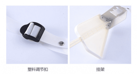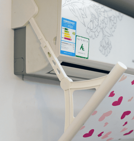 挂架部分设计也差不多,原理还是搭住空调的“双肩”,只是因为伸缩设计支架的下端有向内收缩的力,所以挂架的上方添加了一根带子来平衡。实测收缩力并不是很大,带子稍微搭一下就可以了。