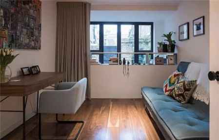 点评:在小复式房间里做了格书房,既可以工作学习还可以当做客房使用,在书桌后方,放置了一个灰色的沙发床,将沙发床拉开就可以变成一个床铺,供客人休息。