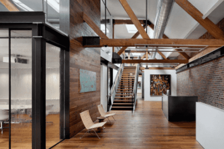 在loft办公室空间设计中,有一个比较都市化的概念,即“交叉空间”,通常以内街、广场等形式出现,在这部分空间内可以设置成展示、打印、临时聚集等多种不同功能的区域,空间布局也不再是传统的整齐、密集,而是一种更加灵活、独特的工作环境。