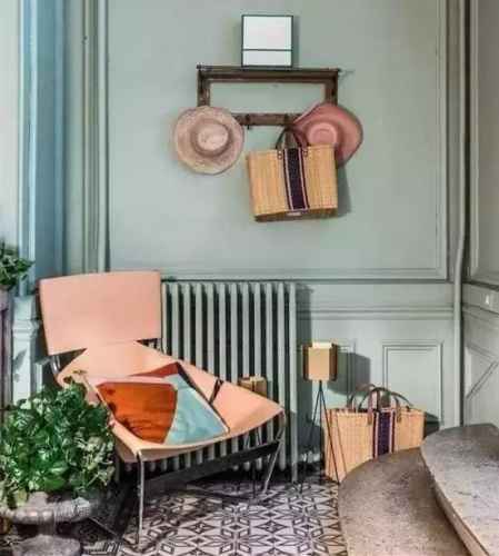 点评:整个房间采用的是青色,座椅旁边的植物让整个房间显得活跃,挂在墙上和放在地上的编织篮更贴近自然,所以暖气片也需要粉刷成跟背景一样的颜色,如果这个地方使用的白色暖气片的话会打破整个房间的氛围。