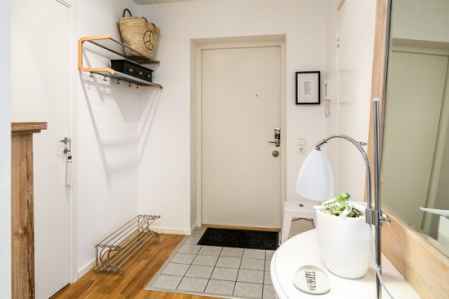 入户玄关处设计很简单,挂衣帽,放鞋子都可以,非常实用,又不占很多空间,右边的镜子也很方便,既可以当穿衣镜,还能放大空间视觉,显得大方又明亮。