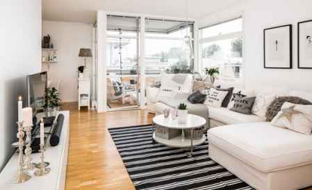 欧式风格的客厅,是以白色调为主,沙发前摆放的地毯,黑白条纹与纯白家具给人一种欧式时尚前卫的感觉。