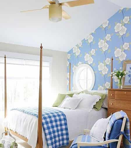 小编点评:蓝色花朵背景墙与蓝色格子寝具互相呼应,十分出色的奠定了整个卧室的田园风格效果。空间以蓝色、白色为主要配色,极好的落地窗采光,让小卧室明朗而清新。