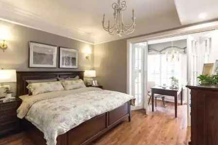 卧室,灰色的乳胶漆墙面,美式大床与家具,看着很气派。靠窗的位置还安置了一个小桌子,使用功能可以自由发挥。