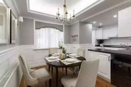 餐厅,厨房与餐厅是融合在一个整体内,白色虽然很不耐脏,可以好好保养真的特别好看。圆形的实木餐桌,四张软包餐椅,看着就很舒适。