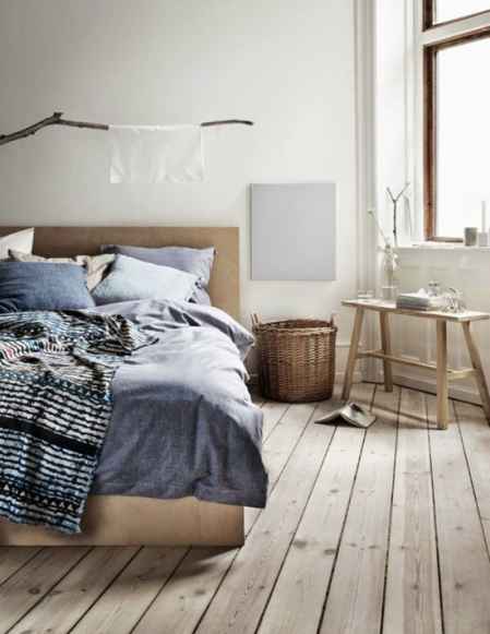 木床、木桌、编织筐,每一件物品都是对自然的直接映射。藏蓝色的床品让空间格调更加宁静致远。长条木地板铺满整个房间,稍稍偏斜的走向刻意营造出一种视觉偏差的效果,粗糙原始的质感充满天然之感。