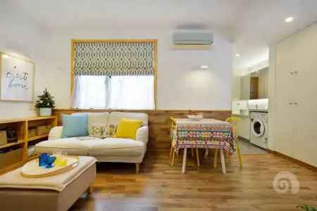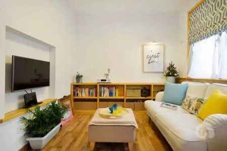 ▲客厅开间小,直接在墙上挖出一块充当电视墙,连电视柜都省去了。你看,直接用脚凳替代茶几就行,这样看电视简直不能更爽。
