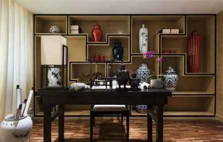 点评:如图所示,这是一款书房的设计,采用书柜与书桌的一体化设计,搭配简单的造型,让居室散发着浓厚的古典韵味,又不失时尚气息。空间注入了传统与现代元素,给人一股浓郁的新东方情调,韵味悠长。