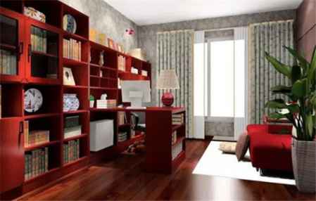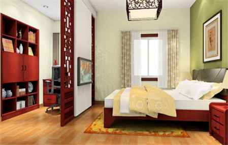 点评:如图所示,这是一款合理的空间布局,采用红色为主调,展现了中式风格的端庄、典雅。卧室采用隔断柜,把卧室书房分隔开,使卧房的功能更加明确,相互**又统一。