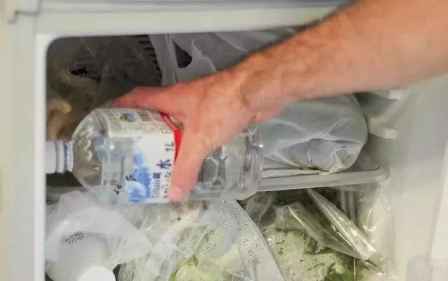 准备一个塑料瓶,往里面加一勺盐,装入2/3的水。加盐有个好处,盐水的凝固点比纯水低,冰过的盐水温度也更低,吸收的热量也会更多。