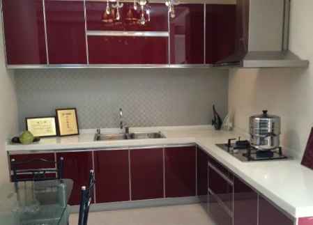 4、野玫瑰红橱柜门: 看起来简约大气,最好配上白色的橱柜台面,很好的给厨房增添一份时尚活力与张力,但是要避免跟硬物磨擦或者高温物体烫伤,以免损伤台面。