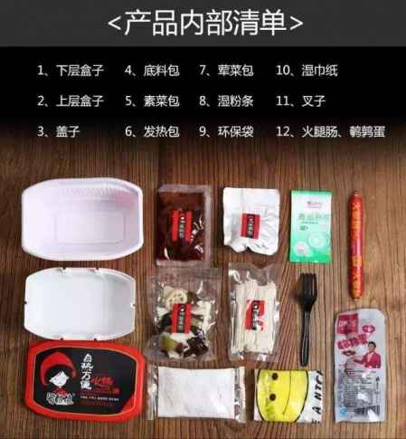 这些成分组成一袋,加入水,靠加水后引发反应。这种无火加热的功能是利用石灰中的氧化钙遇水放热的化学反应,释放热能并产生蒸汽,从而煮熟食物。温度可高达150度以上,蒸汽温度达200度。无火火锅盖设有的小气孔,是用来排走盒内的水蒸气。