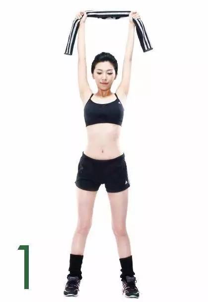 第一步:收下巴令头向下低,然后黄守握住毛巾两端,双手笔直向上举。