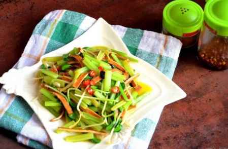 春天容易上火,不同于夏天的“湿热”,属于“燥热”。被古人称为“种生”的豆芽最适合春天吃,因为它能帮助五脏从冬藏转为春生。豆芽有清热的功效,有利于肝气疏通、健脾和胃。黄豆芽健脾养肝,其中维生素B2含量较高,春季适当吃黄豆芽有助于预防口角发炎。绿豆芽容易消化,具有清热解毒、利尿除湿的作用。黑豆芽含有丰富的钙、磷、铁、钾等矿物质及多种维生素,含量比绿豆芽还高。一般在芽高3-10厘米时食用。食材:芹菜、黑豆芽、卤豆干、1个辣椒、姜5克、3/4茶匙盐、1/4茶匙蘑菇精、适量水淀粉、植物油