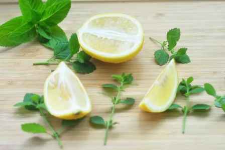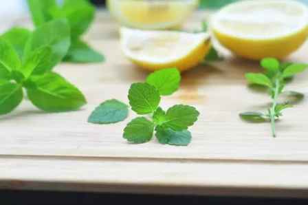 将**水倒入模具,每个模具中放4-5片薄荷叶,放入冰箱中冷冻一晚。