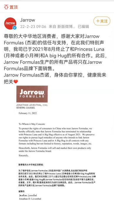 目前Jarrow杰诺品牌在国内已经终止了和Princess Luna(月神或小月神)终止了合作,并在天猫国际陆续开始预售,请锁定天猫店铺——Jarrow海外旗舰。
