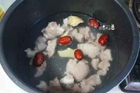 3 | 羊肉清洗干净加红枣姜片放入电饭锅选择“炖汤”模式;如果用煤气炉,煮沸后中小火煲1个半小时左右