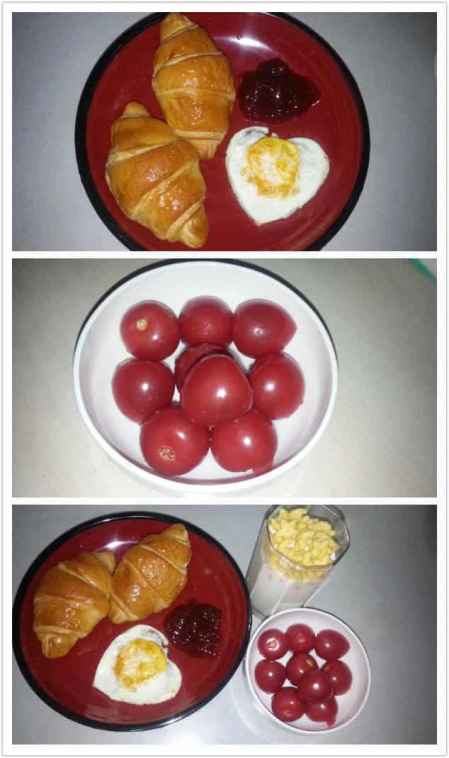 罗宝买的牛角包沾草莓酱,外加一个爱心煎蛋、一杯牛奶脆谷乐、一份圣女果!简单、营养、美味!