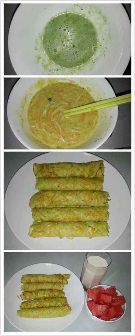 黄瓜打碎、两个鸡蛋、一把面粉、胡萝卜丝、火腿丝、花椒粉、盐、香油、搅拌成面糊,平底锅小火摊成薄饼,出锅后卷起!特伦苏放入豆沙馅加热后搅匀,再搭配一份西瓜!就ok了!