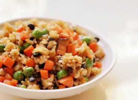 食材:大米 (350克)、糯米 (70克)、胡萝卜 (100克)、土豆 (150克)、去皮五花肉 (180克)、干香菇 (5朵)、豌豆 (55克)、老抽 (半汤匙)、盐 (适量)、植物油 (少许)、葱花 (少许)、姜末 (少许)。