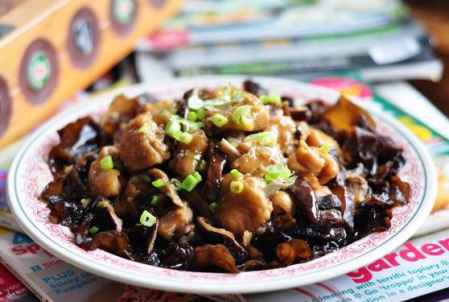 3、蒸鸡:把腌好的鸡肉拌上姜丝、杞子,放在冬菇上,水开后下锅蒸12分钟即可。
