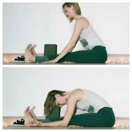 坐在瑜伽垫上,双腿向前伸直。双腿中间放置瑜伽砖,双手手掌放在体侧,手臂伸直,背部挺直。伸展双手尽量向前放在双脚的两侧。躯干下弯,曲肘,头部倚靠在瑜伽砖上,放松,保持30秒到1分钟。