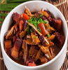5、再用小火焖15分钟左右,视汤汁将稠干时,再在旺火上颠翻,使卤汁裹住冬笋条,淋入香油,出锅装盘。