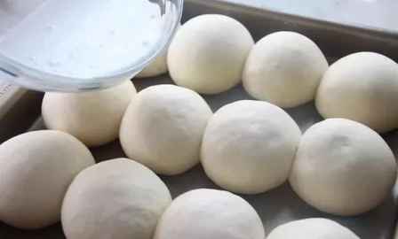 2)将一次发酵好的面团倒出,按压一下,排掉一些气体,分割成几个小面团滚圆,覆膜,放置15分钟。按压的原因是让酵母们排掉多余的气体,分解更多的糖,为下次发酵留出空间。