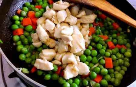 2、烧热锅子,加油,爆蒜末、姜片,加入鸡丁炒至颜色开始变白,下入青豆、胡萝卜翻炒,适当调味后出锅。