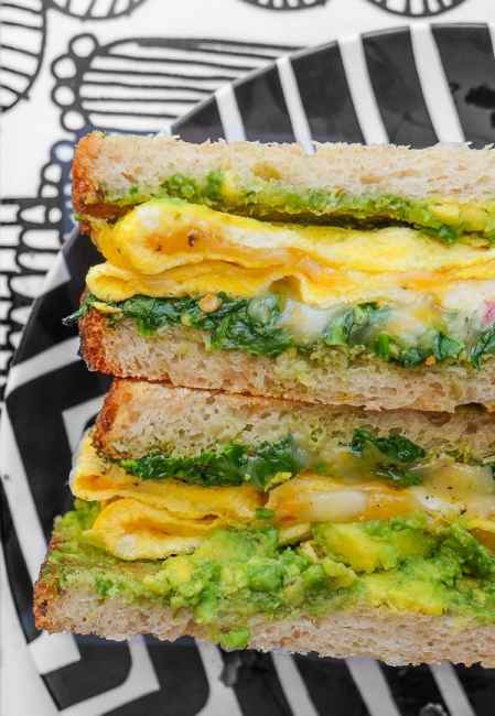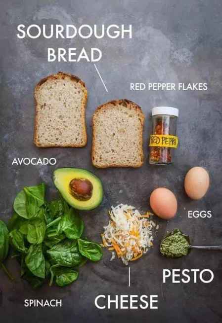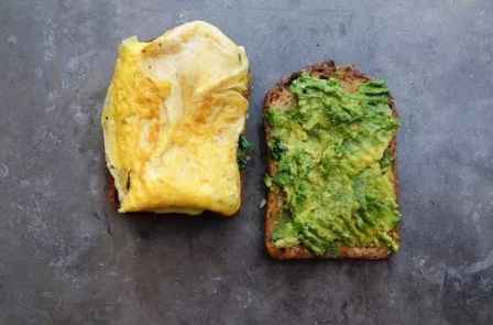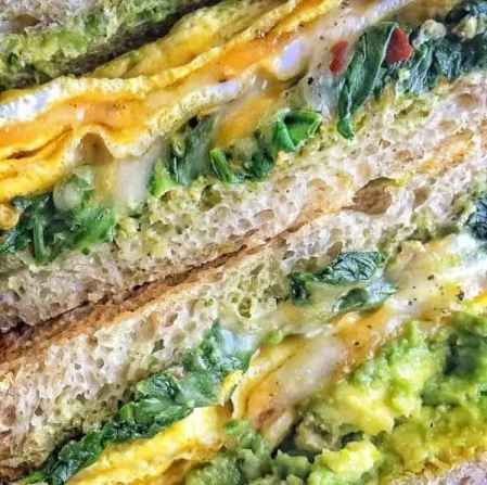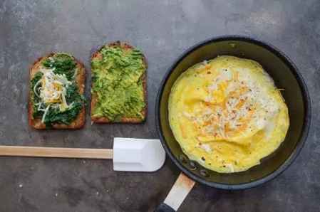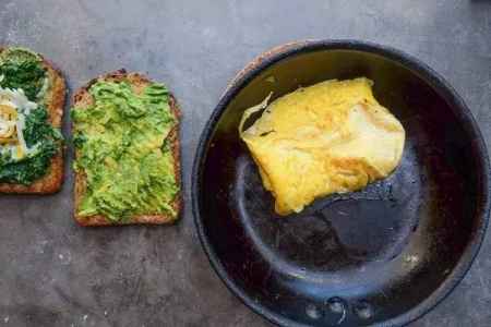 材 料 面包2片、鸡蛋2个、牛油果半个,切片、菠菜300g、辣椒片少许、橄榄油1茶匙、芝士30g、盐少许、香蒜沙司1勺(可用蛋黄酱替代)。
