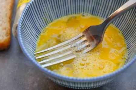 ▼将打好的鸡蛋倒入锅中,煎至半熟,中间撒上芝士。