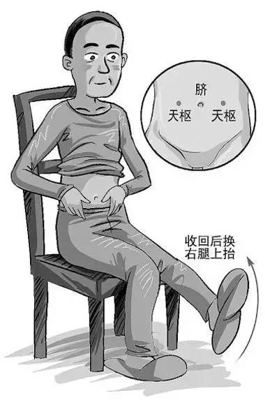两腿并拢坐在椅子上,按压天枢穴,左腿尽量向上抬,然后收回,换右腿上抬、收回为1次,反复做5次。在**时,可以用左手中指点压左侧天枢穴,至有酸胀感时按住不动,坚持一分钟左右即有便意,然后屏气增加腹内压力即可排便。