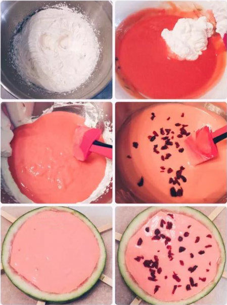 材料:西瓜,西瓜汁、玉米淀粉、淡奶油、砂糖、奶粉、蔓越莓干、红**素