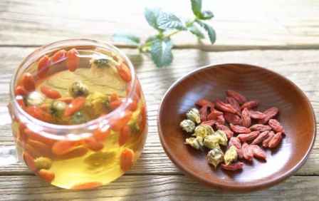 3、放入准备好的胎菊花,加入枸杞,凉一会即可饮用。