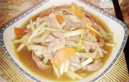 做法:韭黄洗净切段,猪腰洗净切成薄片。热油后放入猪腰,炒透后放入韭黄、姜丝,韭黄熟后,加盐、味精调味后取出即成。