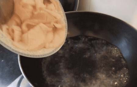 3、等鱿鱼入锅后就要紧盯着它,首先它会卷曲起来,然后颜色变成白色,等鱿鱼全部变成白色就可以出锅了。此时捞出鱿鱼用冷水冲凉。从鱿鱼入锅到出锅的时间大约为10~15秒。