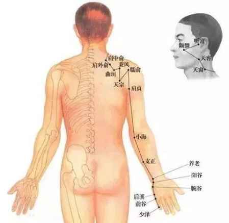 有人要问了,医生给我在肩颈部疏通了经络,为何刚刚按摩后感觉舒坦,时间一长怎么还是没有用呢?那是因为:主管颈椎的经络并不在肩颈部,而在两条胳膊的外侧——小肠经。