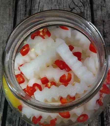 主料:白萝卜500克、小米椒2根、冰糖50克、白醋50克、盐4克、**半个