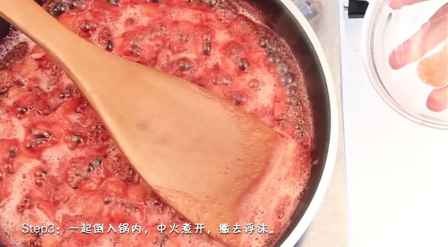 3、草莓倒入锅中,中火煮开,撇去浮沫