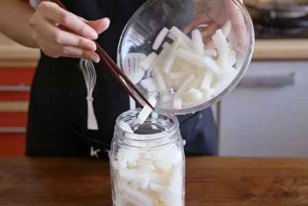 3.将腌好的萝卜用水洗一下,装入罐子里。