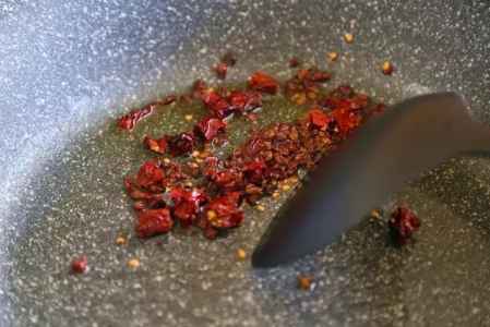 4.将干辣椒剪成小段,热锅下油,将花椒和干辣椒炒香,盛出备用。